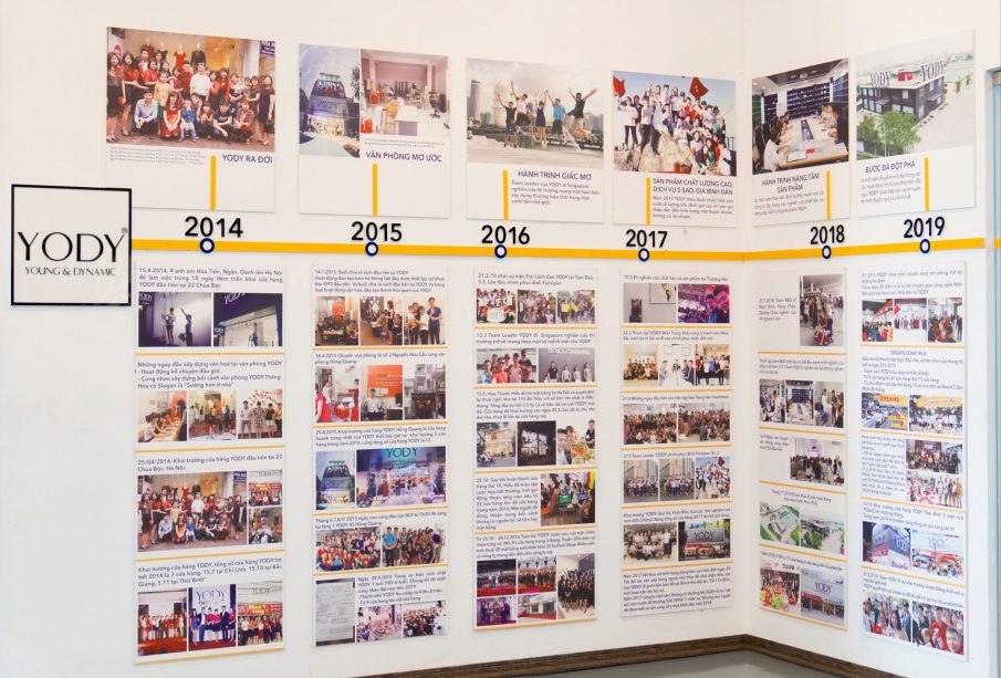 Để khắc ghi lại dấu mốc trưởng thành của mình, tại mỗi văn phòng của YODY chúng tôi xây dựng lên những bức tường lịch sử đó là nơi ghi lại những chiến tích hào hùng, là niềm tự hào, niềm kiêu hãnh của YODY với đồng nghiệp, đối tác và khách hàng.