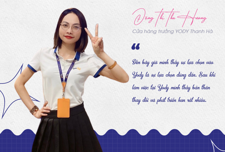 “YODY xin chào. Mình là Hương, hiện đang là Cửa hàng trưởng YODY Thanh Hà. Mình vào YODY cũng là một cái duyên. Thời gian đó mình mới nghỉ ở công ty cũ, đang mông lung chưa biết nên làm công việc gì tiếp theo thì vô tình thấy tin tuyển dụng của YODY. Mình đọc thông tin thì thấy thời gian làm việc xoay ca linh hoạt nên đã thử ứng tuyển và không ngờ là mình đã gắn bó với YODY được hơn 4 năm rồi.